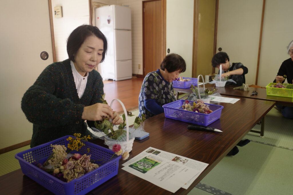 講師の今城さんは、高岡市醍醐で海藻アルギットを利用した有機栽培の農業と、ハーブ農園を営まれ、アレンジメントの教室も開講。農園についての新聞記事を目にしたメンバーが今城さんのアトリエを訪ね、その美しさに感動したことが講習会のきっかけになりました。