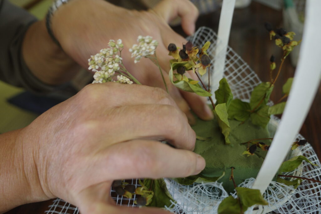 まずは一番初めの土台づくり。対角線で分けた4区画を意識しながら、バランスよく花を挿していきます。初めにいれたのは、グリーンヒペリカム。