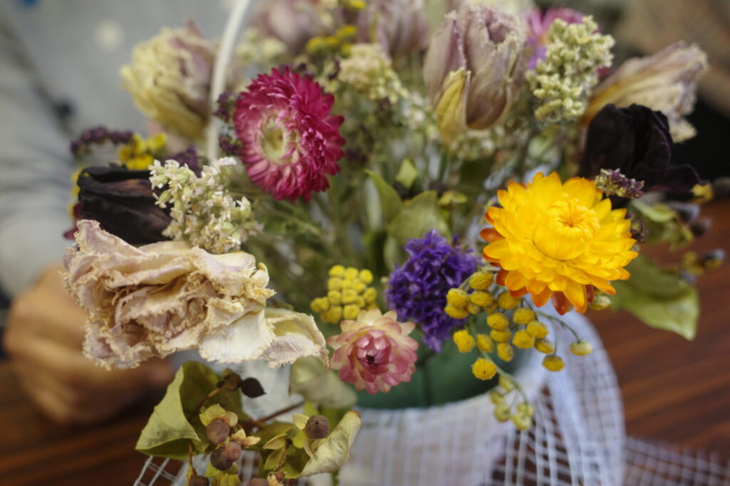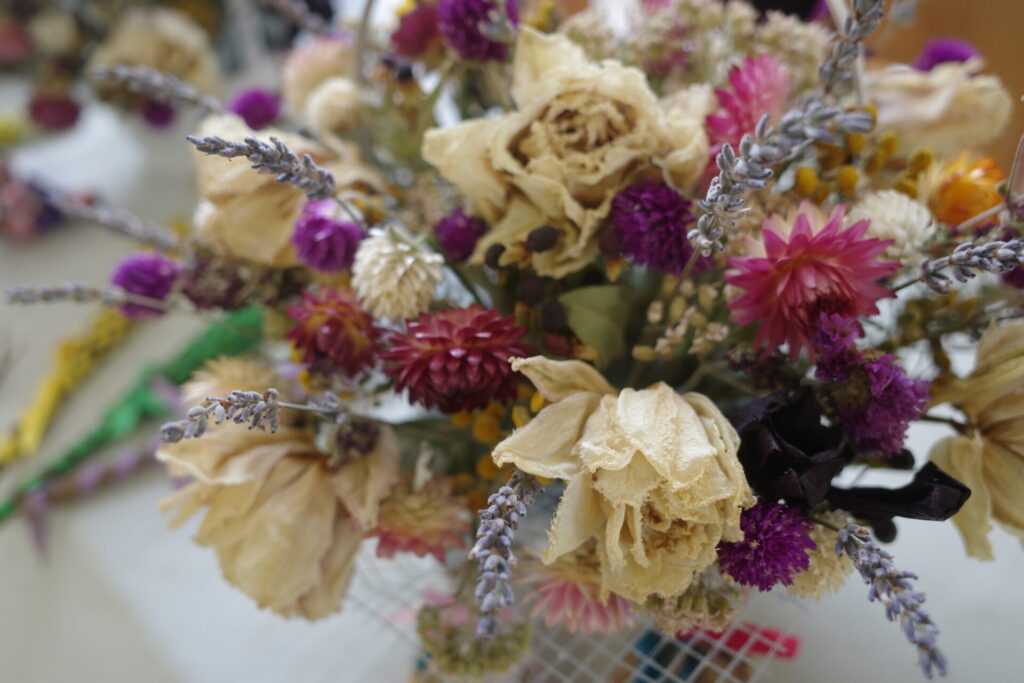 今回使用するドライフラワーはすべて、今城農園で栽培されたもの。ドライフラワーの作り方についてもお話を聞きながら、各々のアレンジメントをつくっていきます💪