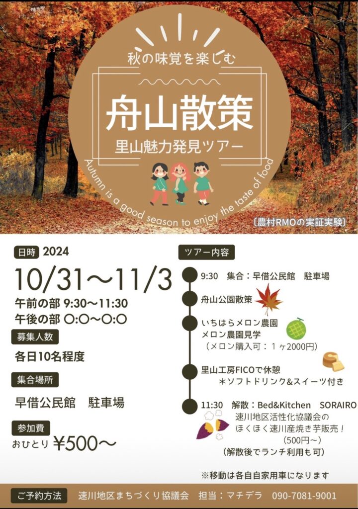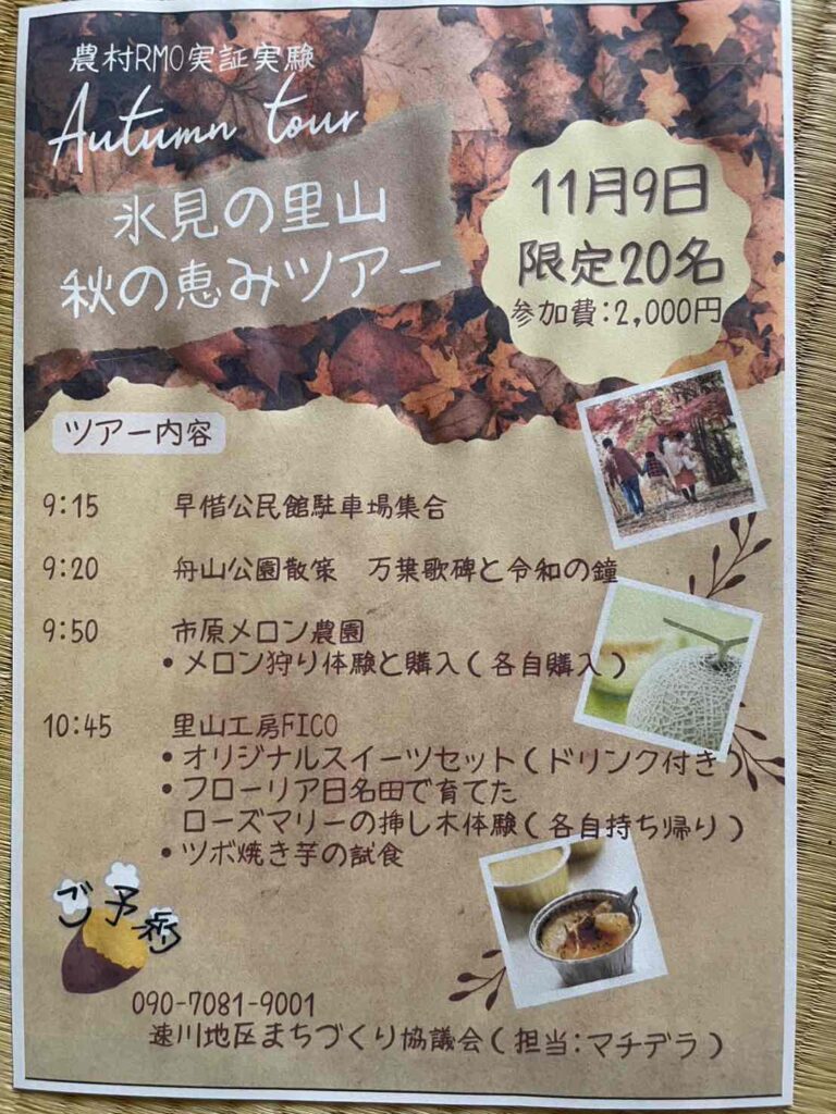 2024年と2025年には春・夏・秋それぞれに地域を巡るツアーを実施。舟山公園、市原メロン農園、里山工房ficoを訪ね、参加する人に四季折々の魅力を伝えました。