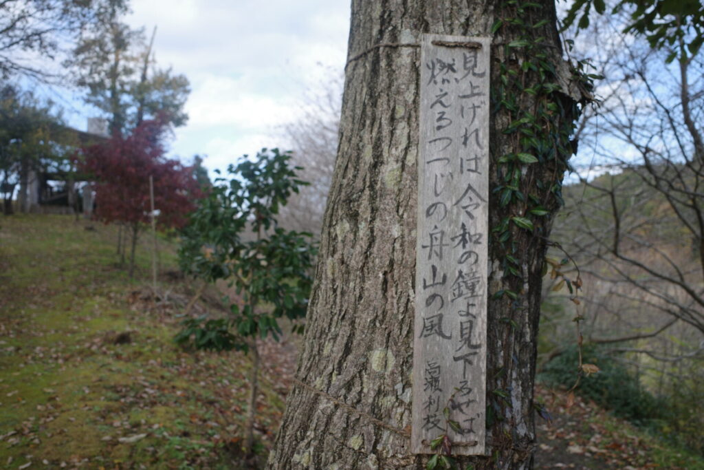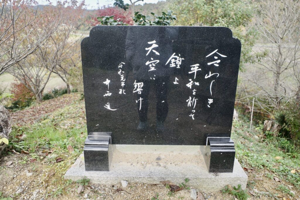 「舟山公園は田舎の小さな公園ですが、万葉と令和を体感が出来る日本でも貴重な公園です。万葉に想いを馳せながら、令和ゆかりの公園を散策してみませんか。元号令和の考案者中西進先生が平和への願いを込められた日本で唯一の歌碑と鐘が有ります。天空に響くように鐘を鳴らしましょう」